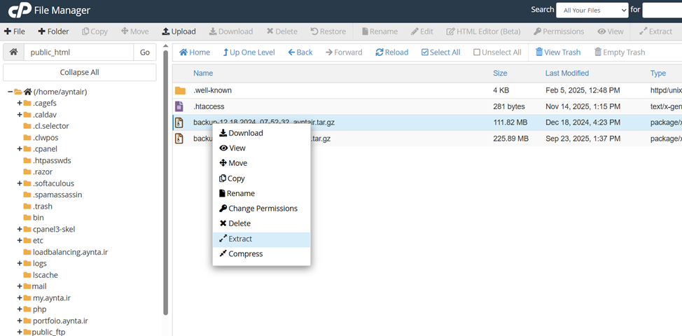 بعد از اینکه آپلود تمام شد، فایل ZIP را در همان مسیر public_html خواهید دید. روی آن راستکلیک کنید و گزینه Extract را بزنید تا همه فایلها از حالت فشرده خارج شوند.