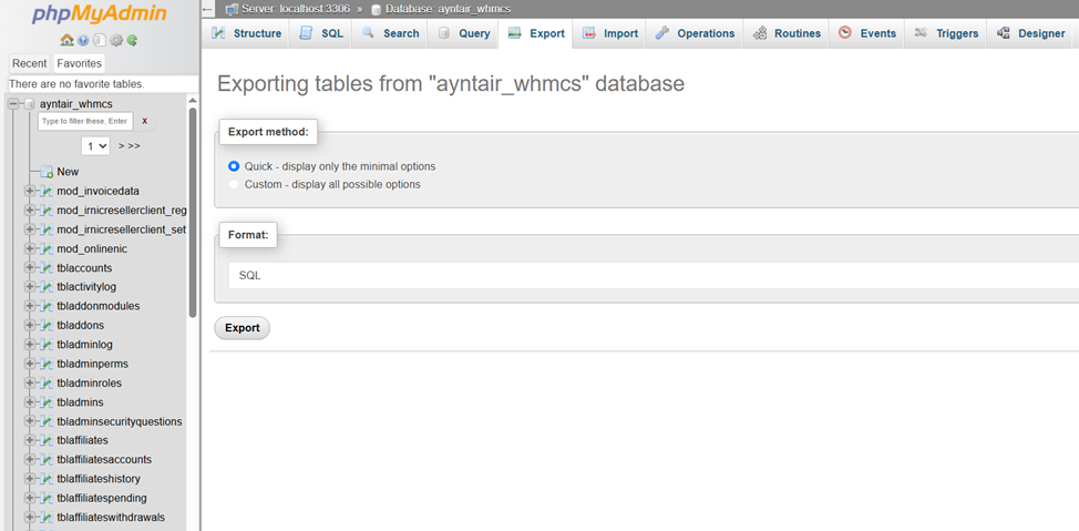 بعد از ورود به phpMyAdmin، از ستون سمت چپ روی نام دیتابیسی که میخواهید از آن خروجی بگیرید کلیک کنید. سپس از نوار بالا وارد بخش Export شوید. در قسمت Format گزینه SQL را انتخاب کنید و در پایان دکمه Export را بزنید. حالا بسته به حجم دیتابیس کمی صبر کنید تا فایل خروجی آماده شود. پس از آماده شدن، آن را دانلود کرده و روی سیستم خود ذخیره کنید.