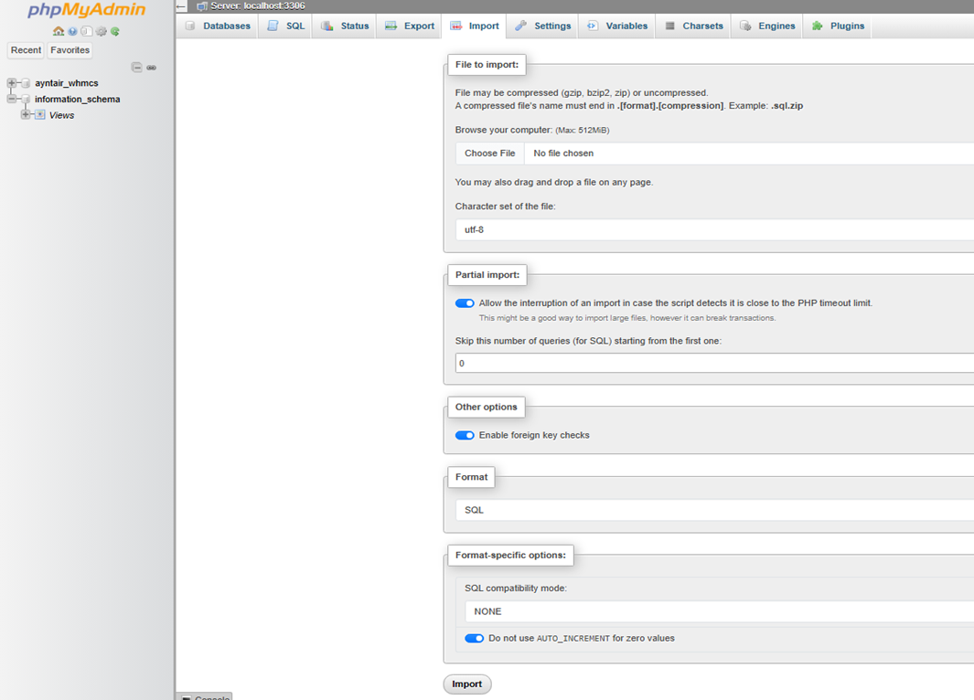پس از ورود به phpMyAdmin، دیتابیس جدید را انتخاب کنید و روی Import در بالای صفحه کلیک کنید.