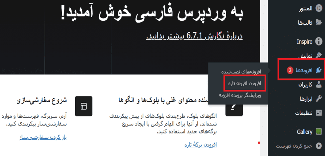 ابتدا وارد وردپرس سایت مدنظر شده وسپس از بخش افزونه ها وارد شده و بر روی گزینه افزودن افزونه تازه کلیک میکنیم.